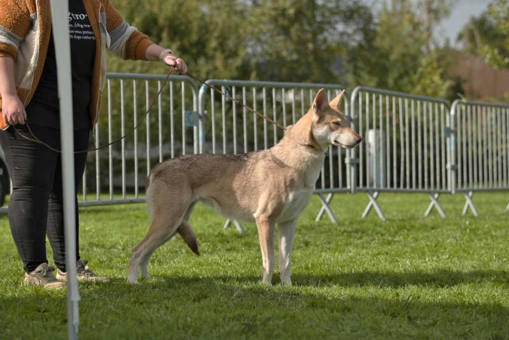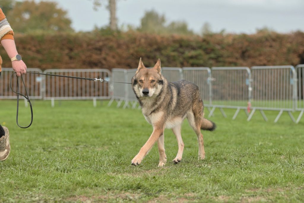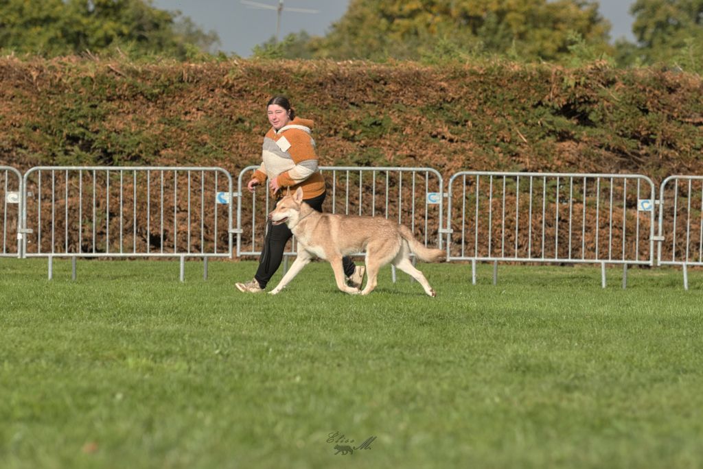 Femelle de 2 ans et 4 mois. Petite. Bonnes proportions corporelles, mais pourrait être un peu plus puissante. Tête bien proportionnée. Bon stop. Articulé en ciseaux complet, oeil clair en amande. Oreille bien portée. Dos droit. Bonne ligne du dessous. Angulation antérieure modérée, angulation postérieure légèrement prononcée. Robe d'été gris loup. Se déplace avec aisance sur le ring et beaucoup d'énergie.