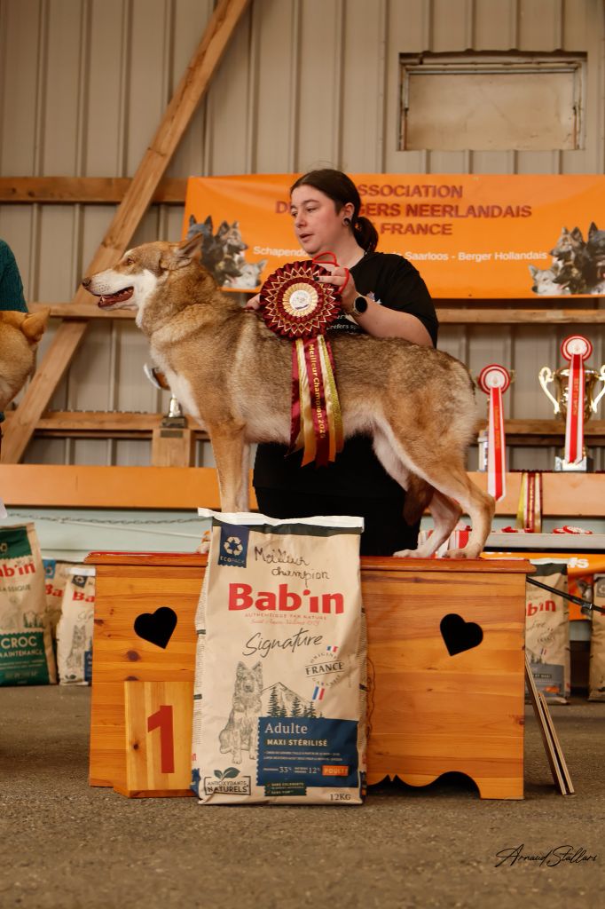 DCC. Bonne taille. Grise. Bonnes proportions. Excellente ossature. Excellents aplombs. Encolure dégagée. Jolie tête lupoïde. Masque typique. Excellente pigmentation. Jolis yeux jaunes. Excellente oreilles mobiles. Beau mouvement. Tête un peu relevée.