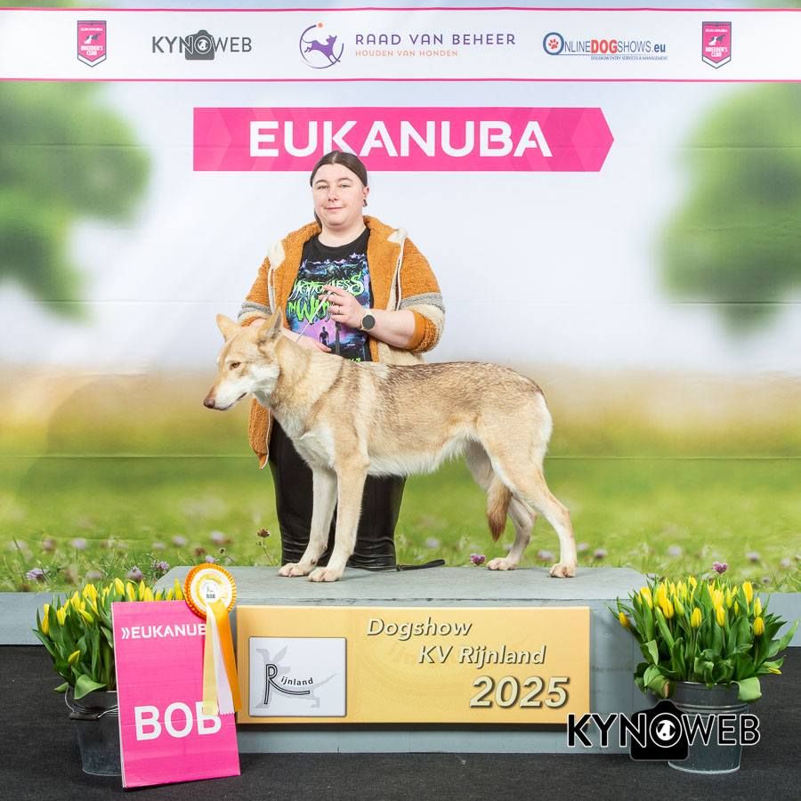 Male typique de 27 mois avec une très belle tête et une expression expressive remarquable. Yeux jaunes en amande. Cou musclé de longueur moyenne, dos droit et ferme, queue bien attachée et portée. Ossature harmonieuse, avant-main droite, épaules très bien positionnées. Angulations générales excellentes. Robe typique de la race, semblable à celle du loup. Très belle présentation.